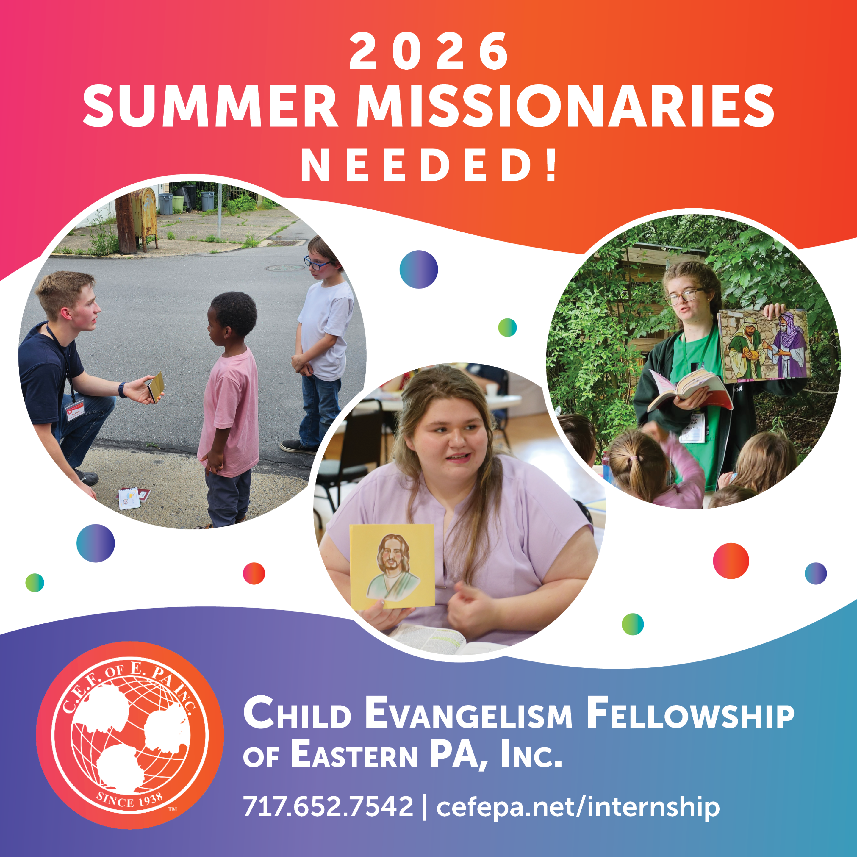 The Summer Missionary program of Child Evangelism Fellowship of Eastern PA, Inc. is a paid internship program designed for Christian college and high school students to learn how to evangelize and teach children in the various counties throughout Eastern PA. This commitment is a nine-week* period of service which includes two weeks of Summer Missionary Training School, one week to rest and refresh, and six weeks of missionary service teaching 5-Day Clubs, Vacation Bible Schools, Good News Day Camps, and participation in ministry promotional activities.